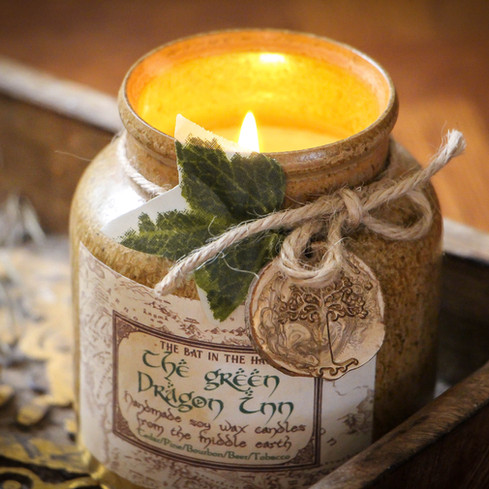 L'auberge du Dragon Vert est issue de la collection du Seigneur des Anneaux sortie au mois de mars dernier. Stéphanie a réalisé des merveilles et il n'en fallait pas plus pour séduire mon âme de Hobbit. Grande jarre ancienne en céramique mouchetée, cordelette en jute et petite feuille de lierre, rondelle de bois cachetée d'un arbre de vie en cire dorée. Tout est dans le détail, si bien qu'en prenant les photos pour l'article je me suis aperçue que l'arrière plan de l'étiquette représentait la Terre du Milieu. Il est décrit un cocktail de bois de cèdre, de bière, de tabac et de vieux bourbon.